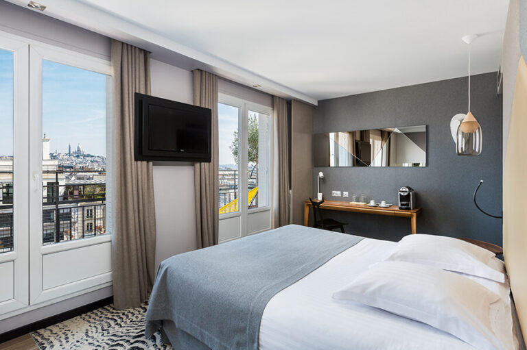 Spacieuses, les chambres Deluxe Vue Sacré-Cœur offrent un niveau de confort supérieur et s’ouvrent sur un balcon avec vue sur les toits de Paris et Montmartre.